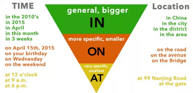 怎么样,是不是豁然开朗?你从前的老师有没有教过你in、on和at这三个词在表示时间地点时,具有从大到小、从宽泛到具体这样的抽象概念和规律?